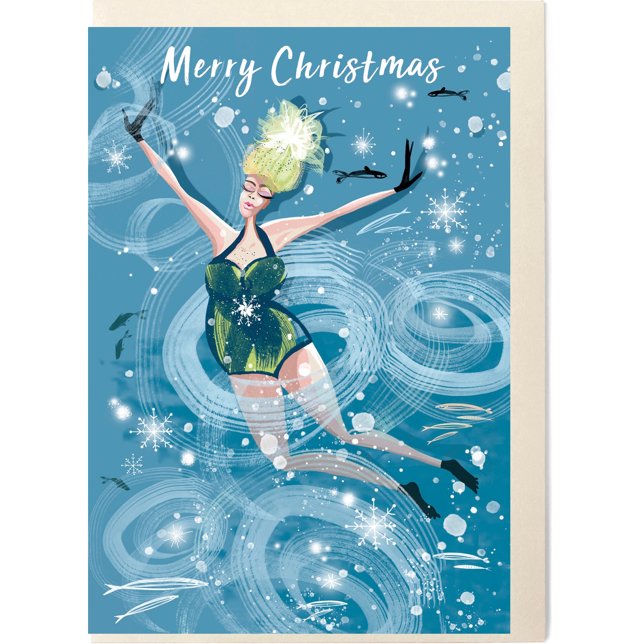 'ICING ON THE LAKE' card design With caption 'Merry Christmas' from the series 'Swim Wild & Free' – A collection celebrates the power of outdoor wild cold water swimming for our soul and good health. Take a dip in the wild waters today – and you will never look back.
