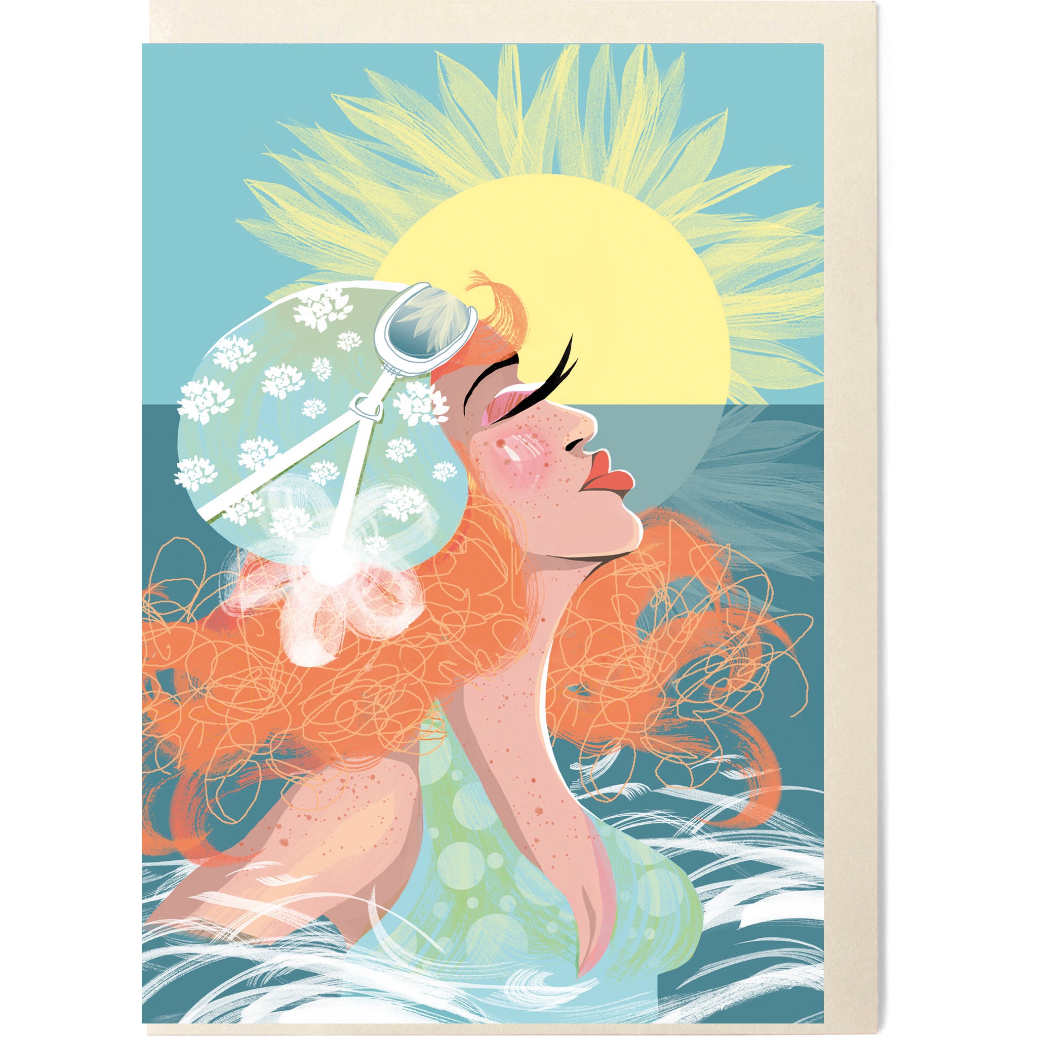 'She Rises' card design from the series 'Swim Wild & Free' – A collection celebrates the power of outdoor wild cold water swimming for our soul and good health. This design shows the bliss and calm of going with the flow of a river. Take a dip in the wild waters today – and you will never look back.