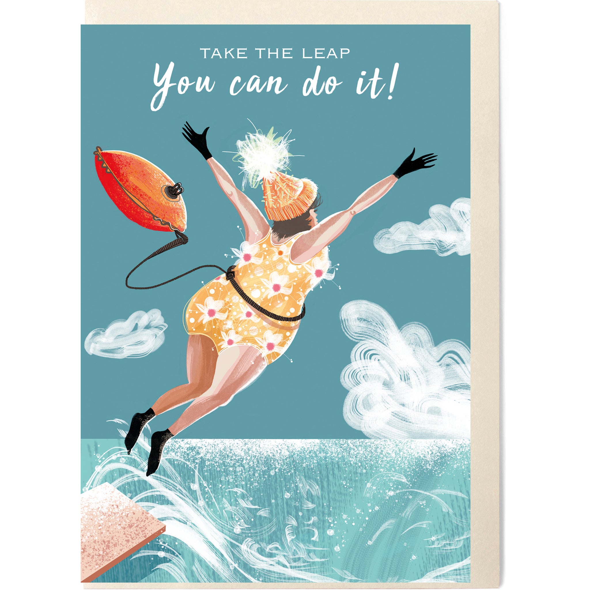 A good luck card 'That Crazy Shelley – Take the leap, You can do it! is from the series 'Swim Wild & Free / text' – A collection celebrates the power of outdoor wild cold water swimming for our soul and good health. Take a dip in the wild waters today – and you will never look back. The ideal card to send words of encouragement to friends and family.